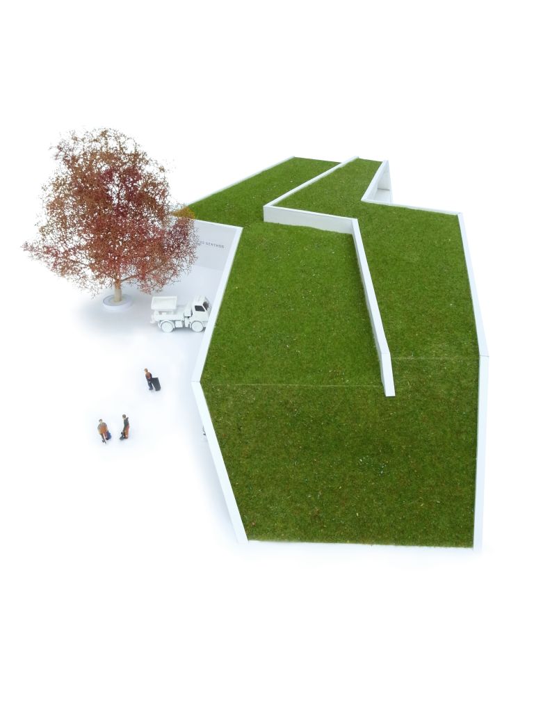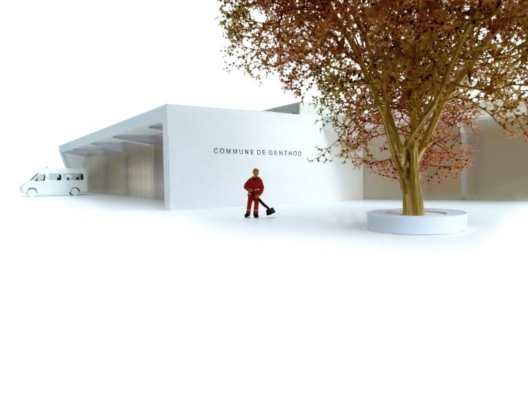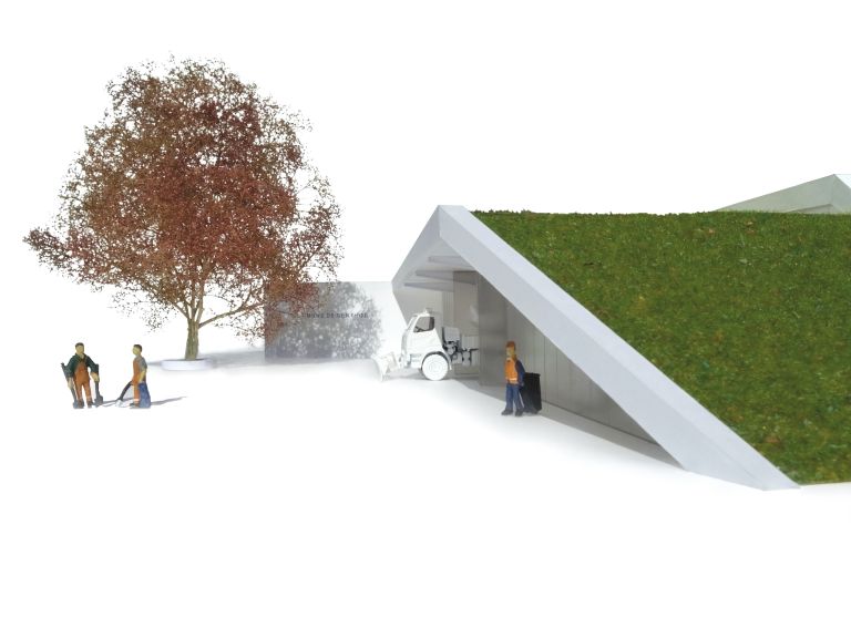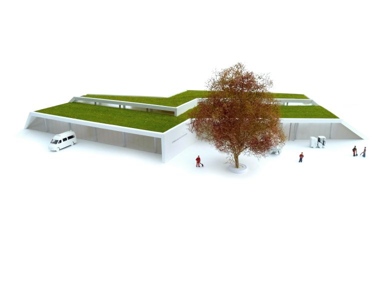 Organisé de manière à réduire son impact volumétrique, le centre de voirie trouve un dialogue harmonieux avec l’échelle des constructions voisines. Le volume émerge progressivement du sol et se pare d’une couverture végétale. En véritable caméléon, la toiture s’habille des différentes couleurs saisonnières.