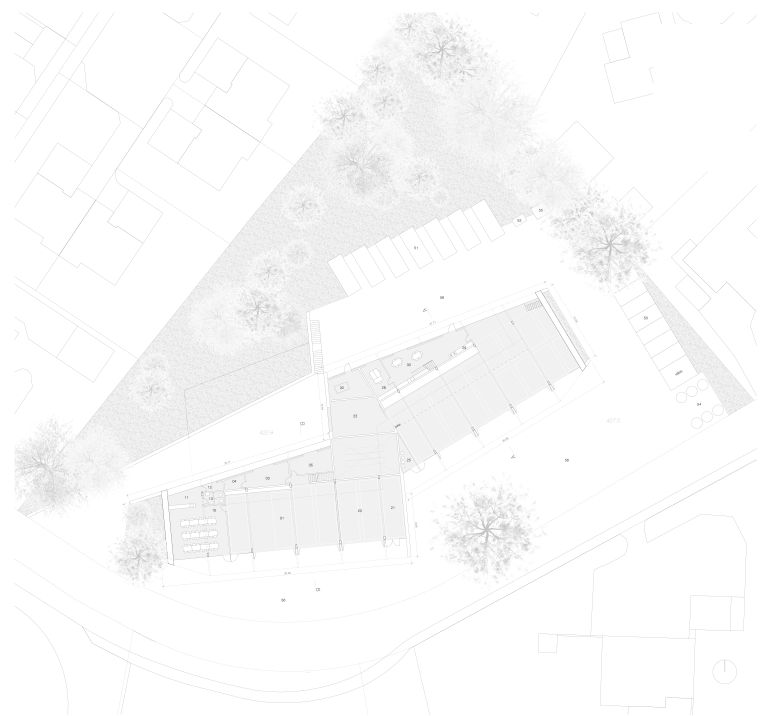 Son implantation suit la courbure de la route d’accès et sa volumétrie se brise afin d’en réduire l’impact. Ce dispositif met en scène l’imposant et respectable cèdre du Chemin des Chênes. Ce dernier articule la volumétrie du complexe et subdivise l’aile de la voirie de celle des pompiers.