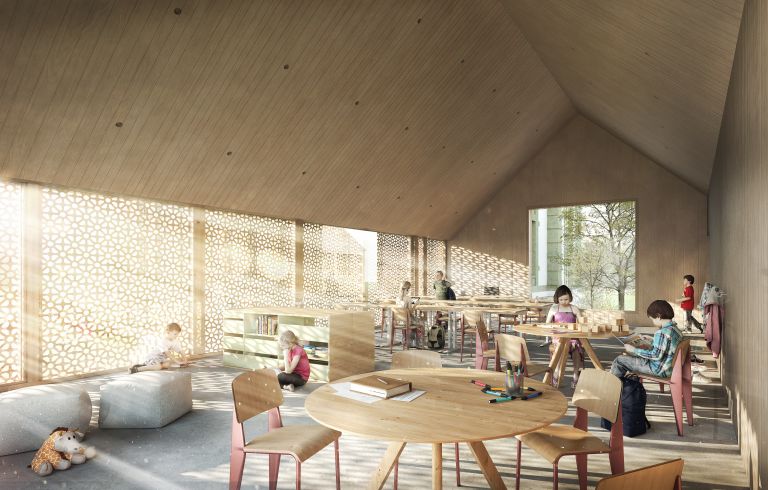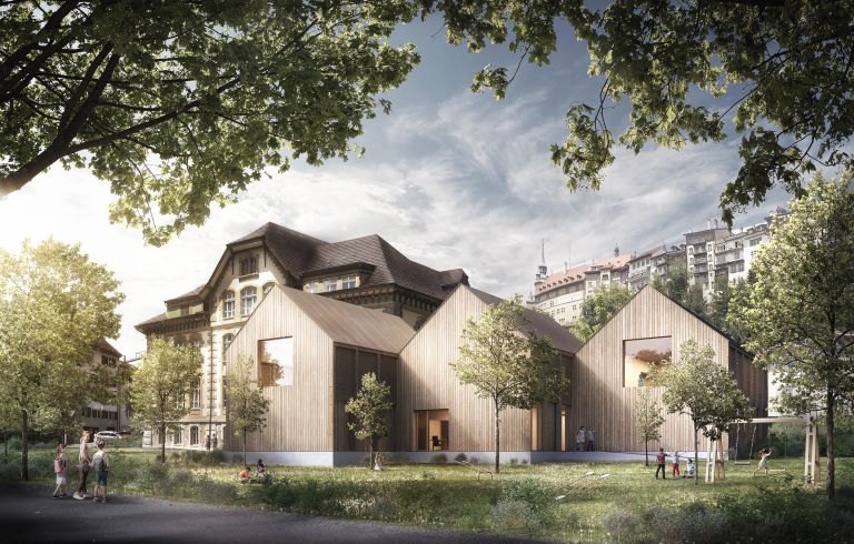 La nouvelle école s'inspire des typologies constructives locales des granges et greniers. Entièrement conçue en bois, elle puise son expression dans l’architecture traditionnelle des typologies du quartier. Le bois permet une identification forte de ce nouvel édifice appelé à cohabiter aux côtés de l’école existante de la Neuveville dont les caractéristiques seront ainsi préservées.