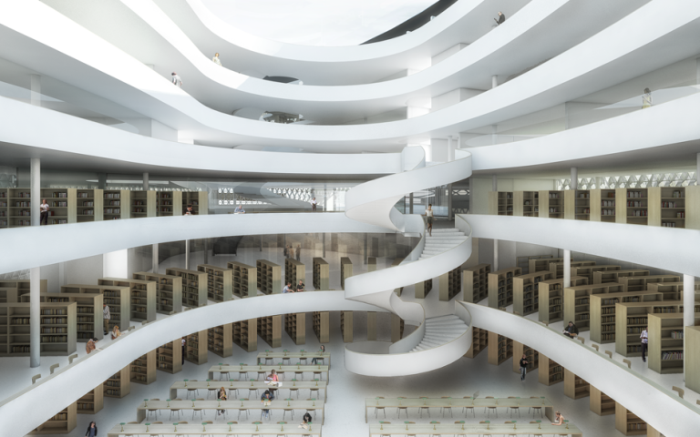 Né d'une définition spatiale de l'espace urbain, la forme elliptique enveloppe avec aisance et sensibilité l'ensemble des fonctions. La simplicité de la trame constructive préserve la richesse des combinaisons programmatiques (flexibilité). La bibliothèque fonctionne de manière interactive avec un programme d'enseignement complet composé d’auditoires, de salles de cours, de cellules de travail individuelles ou en groupe, de zones d’accueil et d'échange. Puit de lumière et espace majeur de l'édifice, la cour centrale de la bibliothèque imprègne l'entier de l'édifice, des niveaux semi-enterrés jusqu'au dernier niveau. Intime, la salle de lecture et de travail se positionne en son centre. Facilement accessible, baignée d'une lumière douce et régulière, protégée des flux de circulation et des conversations, elle cristallise l'attention et invite à la concentration.