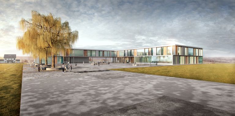 Le projet propose un large espace de référence minéral, orienté vers le centre du village: "La place des écoles". Ce dispositif répond à une situation existante dans laquelle l'espace majeur du terrain de football, formidablement situé à proximité, tente de proposer un espace de référence sans y parvenir véritablement puisqu'il se trouve interdit d'accès aux écoliers.